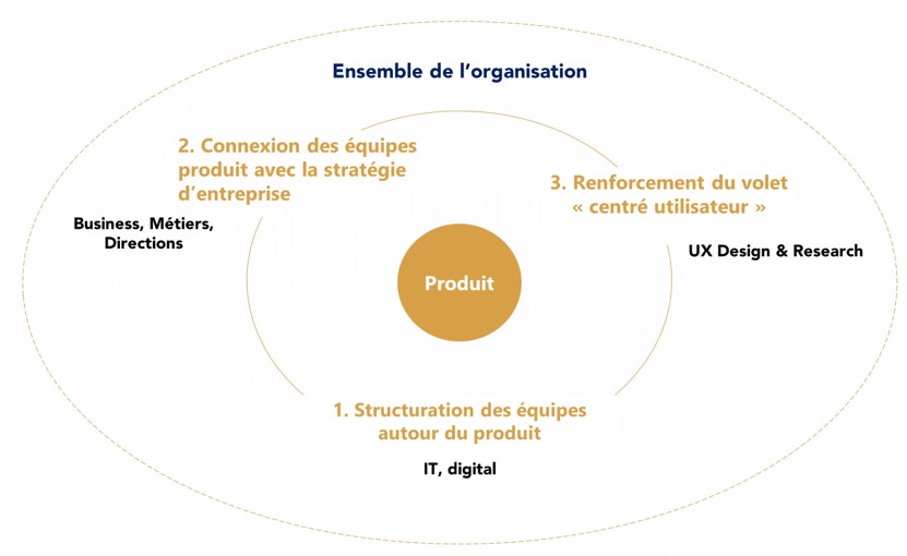 Les retours d’expériences que nous avons menées chez nos clients montrent qu’une approche produit au sein d’un grand groupe doit faire vivre, de façon adaptée à son contexte, trois dimensions particulières :