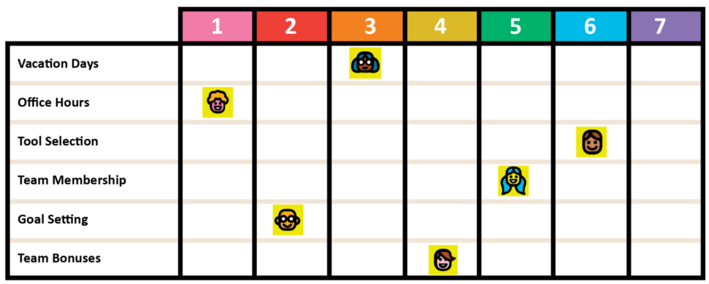 Dans ce tableau de délégation, par exemple, six domaines de décision différents sont cartographiés, chacun avec un niveau de délégation décidé par le manager et son équipe. En un coup d’œil, il est possible de comprendre comment les vacances sont approuvées par le manager sur proposition de l’équipe, tandis que la sélection des outils est décidée par l’équipe puis partagée avec le manager. En utilisant des avatars, vous pouvez même aller jusqu’à détailler la délégation au niveau du collaborateur.