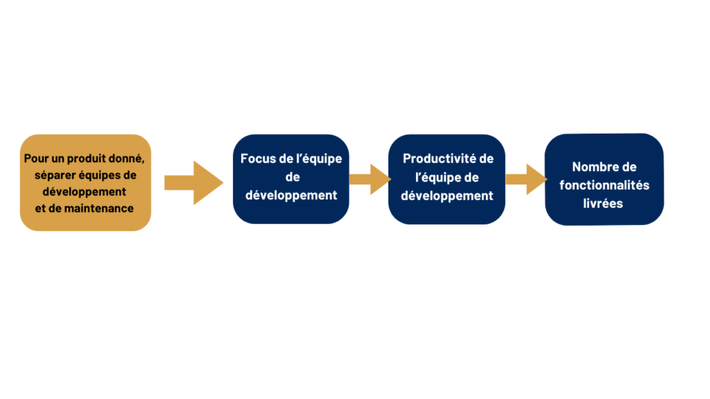 Prenons l’exemple suivant : Un département de R&D considère que trop de temps est passé à la maintenance du produit et pas assez au développement de nouvelles fonctionnalités. Afin de s’assurer que le gros des ressources développera de nouvelles fonctionnalités pour le client, la décision est prise de scinder la R&D entre une équipe de développement et une équipe de maintenance. Ainsi les membres de l’équipe de développement se focaliseront sur les nouveaux développements, sans être perturbé par la correction des bugs.