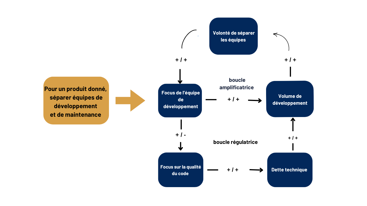 Cette logique de causalité est à la base de technique comme les « 5 pourquoi », le diagramme Fishbone d’Ishikawa ou le modèle SCORE, mais montre ses limites face aux systèmes complexes comme nos entreprises, des « effets de bord » vont apparaitre, les boucles de rétroaction. Par exemple, en ne s’occupant plus de la maintenance, les équipes de développement vont se focaliser sur le volume de code produit, au détriment de la qualité du code et des tests. La dette technique va alors augmenter, rendant plus complexe l’évolution du code et diminuant ainsi la productivité des développements.