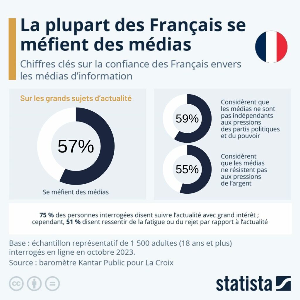 La confiance accordée aux médias demeure relativement faible dans l’Hexagone. En 2023, seul 30% des Français estiment que les informations diffusées par les médias sont fiables, ce qui place la France en bas du classement comparativement à d’autres pays européens (source : Statista). À titre d’exemple, ce taux s’élève à 69% en Finlande ou encore à 58% au Portugal. Les Français expriment principalement une méfiance envers les médias en raison de leur perception d’un manque d’indépendance, que cela soit vis-à-vis des pressions politiques ou financières.
