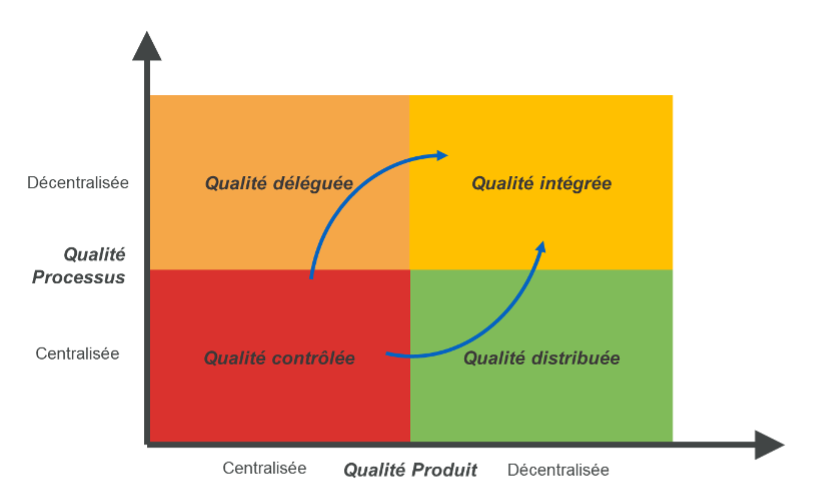 Si nous cherchons à établir une topologie des organisations Qualité en contexte Agile, nous observons une combinatoire entre l’organisation de l’Assurance Qualité Produit et celle de l’Assurance Qualité Processus, selon qu’elles sont respectivement centralisées ou décentralisées.